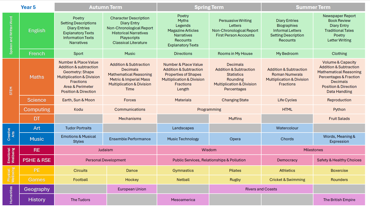 Your child will study a wide variety of topics as part of their curriculum studies at Highfield. Please see below details of the curriculum content that your child will study in Year 5. Whilst each class follows the same curriculum, there will be individualised delivery based on the needs of the class.